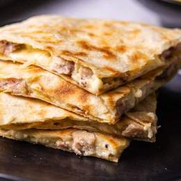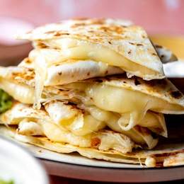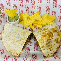 د.م. 80,00Wheat tortilla stuffed with a blend of blue and white cheeses. Served with chips or fries.